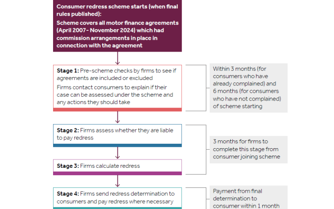 b. Four Stage Process and Timing: The Consultation sets out in four stages the proposed Motor Finance Consumer Redress Scheme and the steps lenders, brokers, and consumers will need to take. Please see the below flow chart that provides an overview of the proposed Motor Finance Consumer Redress Scheme stages and timings.