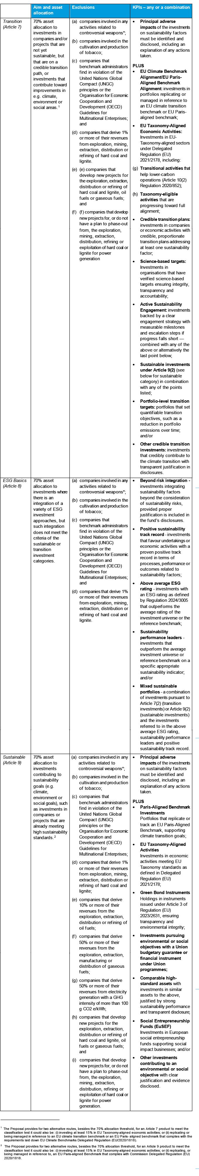 Three core categories are proposed with mandatory criteria, which the European Commission in their accompanying sets out functions on two main criteria (1): exclusions; and (2) positive contribution of a minimum portion 70% of the portfolio’s assets must follow an ESG strategy that matches the claims of the fund on binding basis.